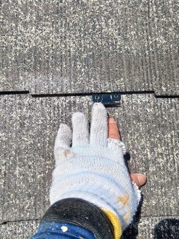 - スレートが重なっている箇所にタスペーサーを差し込みます。上塗りで塗膜が屋根の重なりの隙間を埋めないためです。埋めてしまうと雨漏りに繋がってしまいます。