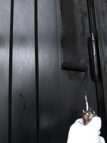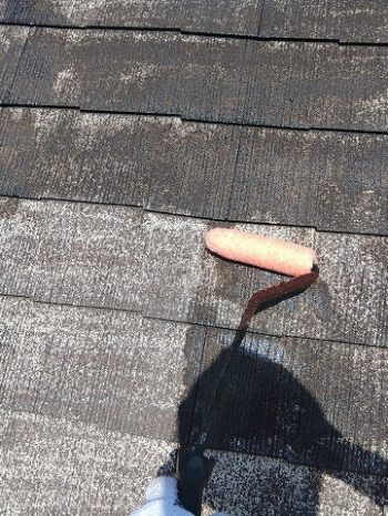 - 屋根の下塗りをしています。上塗り用の塗料が屋根に吸い込ませないために、下塗り材を入れて吸い込みを止めます。