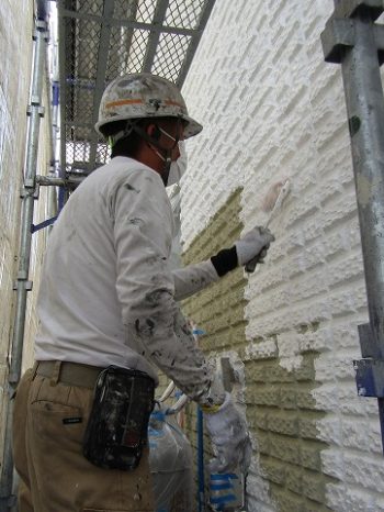- 外壁の下塗りです。凹凸がかなりあるので、塗り残しがないか上下左右から見て確認しました。