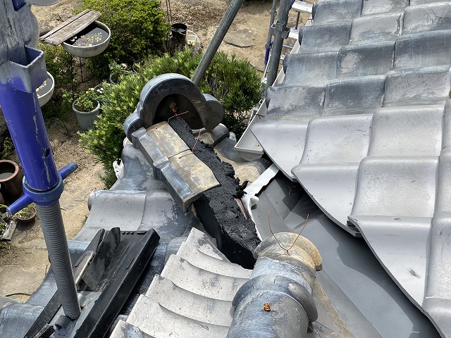 - 撤去した瓦は割れているものは交換、使える瓦は元のように復元していきます。なんばん漆喰の量を調整し組み立てます。