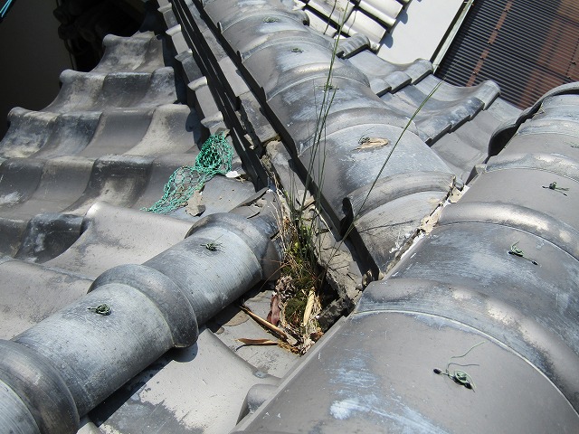 - 屋根には葺き土が流れている箇所が多くあり、草もいろいろなところで生えていました。瓦を一度取って、葺き土の代わりになんばん漆喰で固定します。