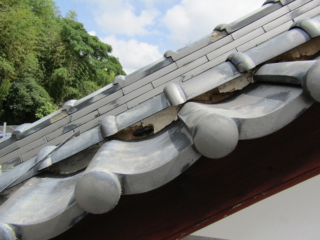 - 漆喰が劣化しボロボロと崩れていました。葺き土も流れ落ちている箇所も多くありました。なんばん漆喰で埋めていきます。