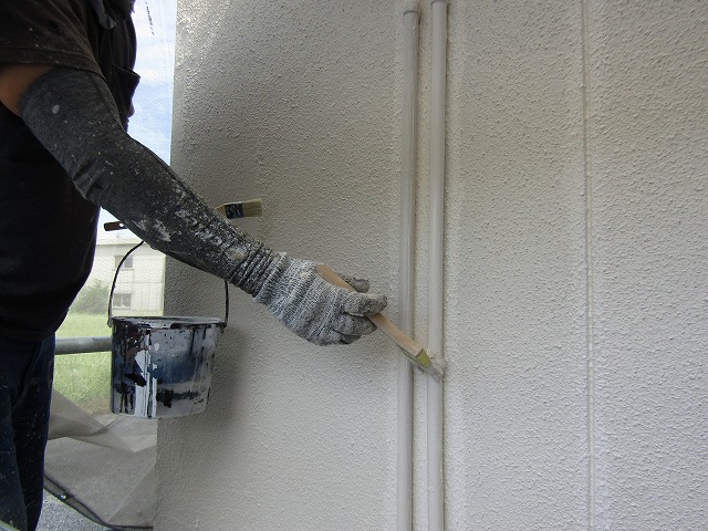 本宅の外壁はサイディングに吹き付け塗装がしてありましたが、経年劣化で外壁の模様も落ちている状態でした。山上げをして模様を作る厚膜凹凸塗装をして塗膜のひび割れを防ぎます。