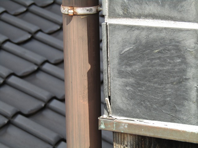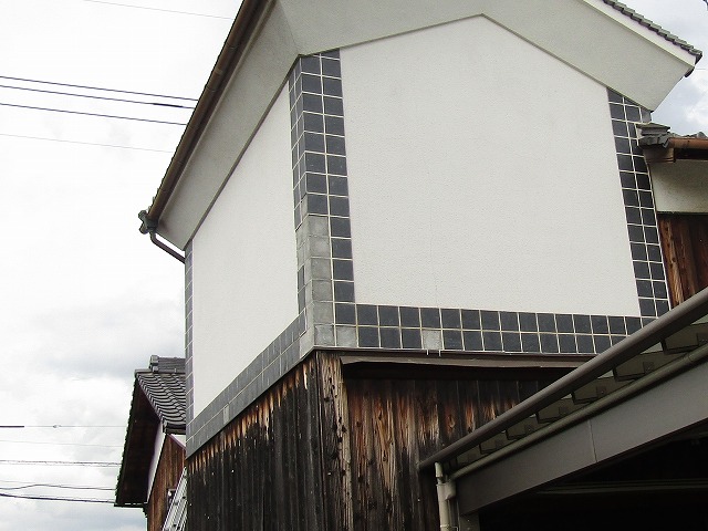 蔵の外壁からの雨漏りをしています。タイルの目地が割れてきてタイルが剥落する恐れがありました。タイルは撤去し、モルタルで埋めます。焼き板の部分は撤去し、木目調のサイディングを貼るご提案をいたしました。