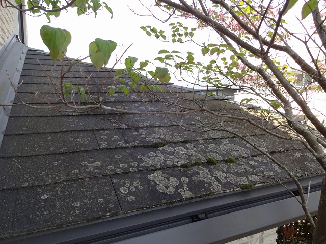 - 1階の屋根の北側です。日が当たらないのでコケや藻がとても生えやすく、生えると広がってしまいます。フッ素塗料でコケを生えにくくします。