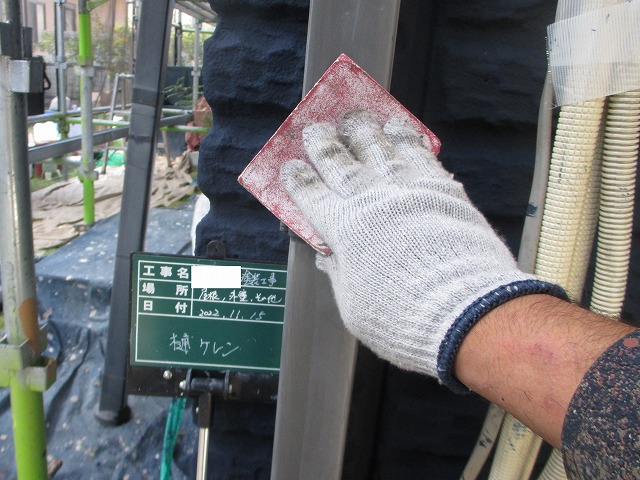 - 樋の塗装の前にケレンを行います。ケレンで細かい傷を付け、塗膜が密着するようにしています。
