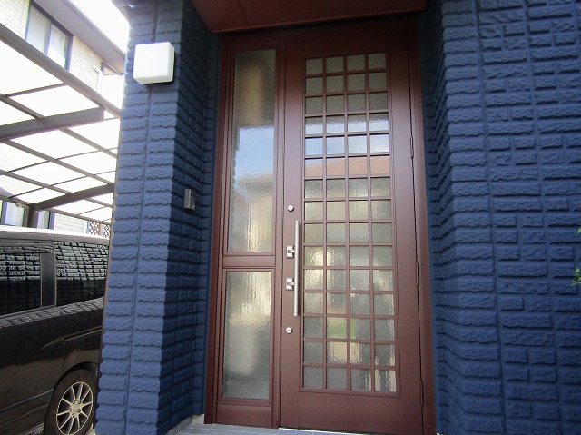 - ドアも塗装しました。軒やバルコニーに合わせた赤みがかった茶色です。美しい仕上がりです。