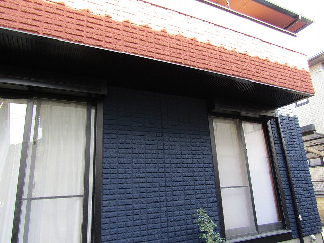 外壁はALCパネルで小さなひび割れでも雨漏りを起こす可能性があります。塗装を定期的に繰り返すことで雨漏りは防ぐことができます。塗装はアートフレッシュで艶消しのマットなデザインで塗装できます。ネイビーと深みのある赤色の2色でおしゃれな仕上がりになりました。