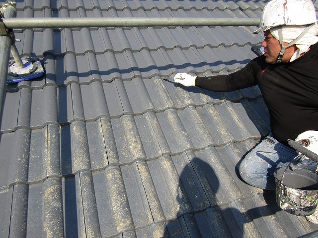 - 屋根の上塗り1回目をしています。屋根は凸凹しているのでローラーだけでなく刷毛も多く使い丁寧に塗ります。