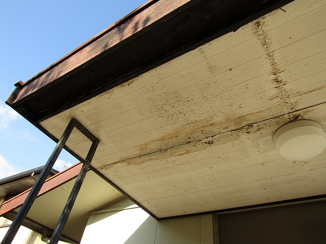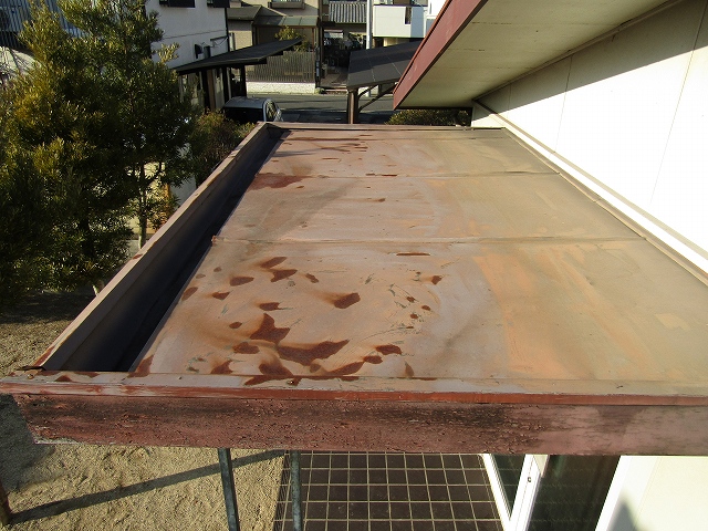 - 玄関上部の屋根は板金ですが、サビによって穴があいていました。板金をカバー工法して修繕します。