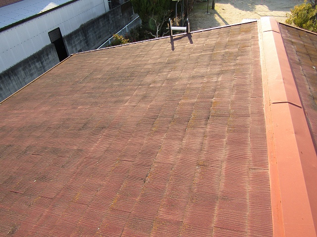 - 屋根はカラーベスト(スレート)でコケが多く生えていました。コケは基材を傷めてしまうのでしっかりと除去していきます。