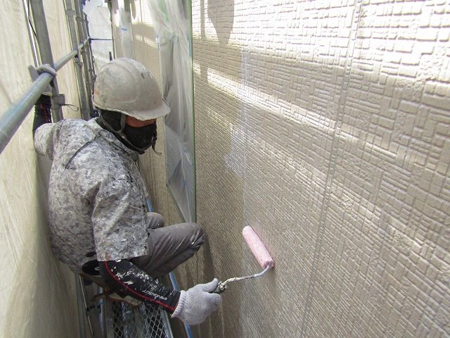- 外壁の下塗りをしています。下塗りは下地補修と上塗り塗料との密着をよくさせる役割があります。