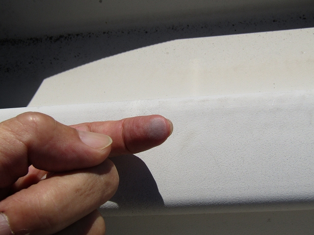 屋根は太陽光パネルが設置してあり、下部は異常ありませんでしたが、紫外線に当たる部分はチョーキングを起こしていました。
