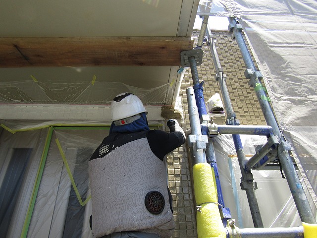 - 外壁の上塗り1回目です。下塗りはひび割れを起こしにくくするサーフエポを塗装しています。
