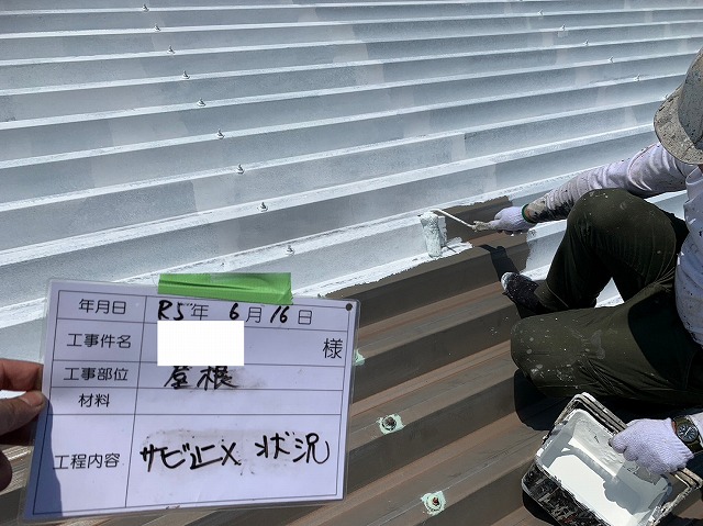 - 屋根の下塗りをしています。下塗りはサビ止めで、板金屋根の下塗りには欠かせません。基材を錆びさせないよう守ります。