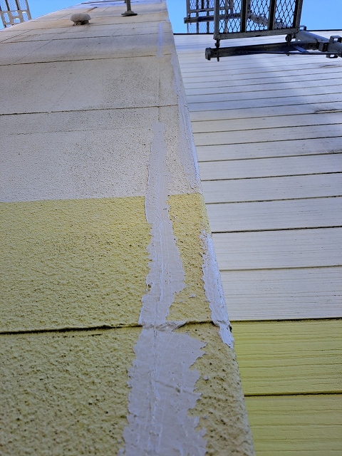 - 施工前です。外壁に大きなクラックがいくつもありました。雨水によってさらに状態が悪化してしまうので、板金で補修します。