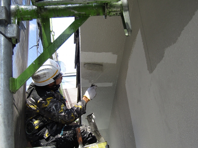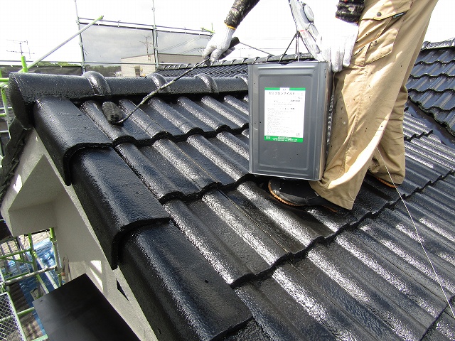 - 屋根の上塗りをしています。しっかりとケレン作業によりスラリー層を除去したので塗装が美しいです。