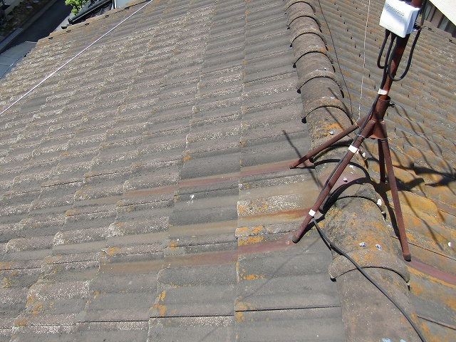 - 施工前の屋根です。屋根は塗装の機能がなくなり、コケがたくさん生えていました。