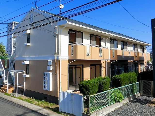 - アパートの施工前の全景です。色褪せや汚れが目立っていました。北側にはコケも多くありました。
