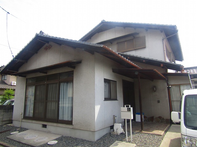 - 塗装前の全景です。モルタル外壁は塗膜の性能が落ち、濡れると水分を吸収する状態でした。
