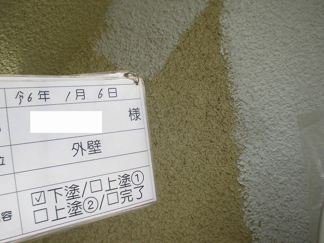 - 外壁の下塗りをしています。外壁のモルタル部には割れにくいサーフで下塗りしました。