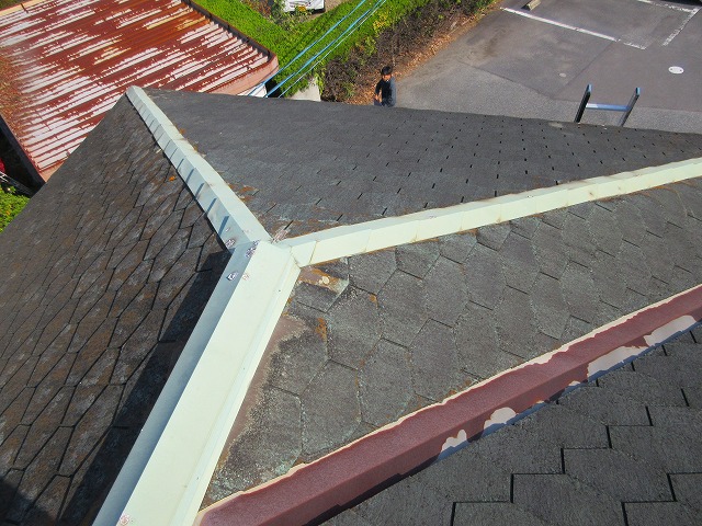 - 屋根の施工前です。屋根材にコケや谷板金のサビなど傷んでいました。
