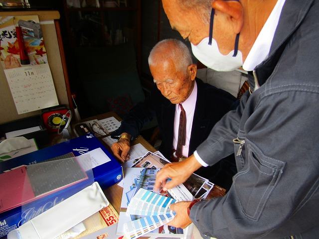 - 色の打ち合わせをしています。お客様のご希望の色や雰囲気を聞き取り、カラーシミュレーションや塗り板を作成します。