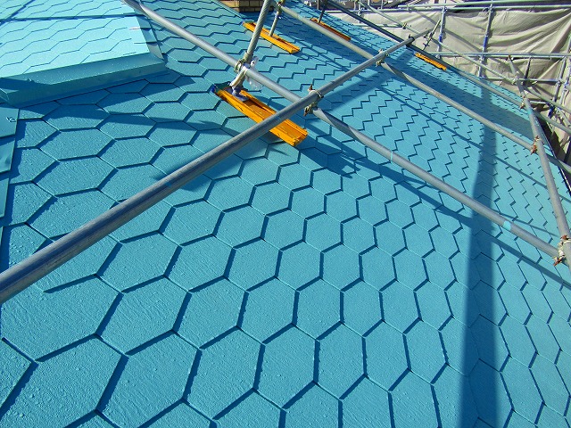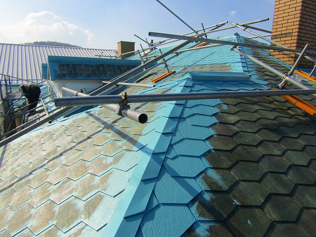 - 屋根の塗装です。洗浄作業から下地処理、下塗りをして上塗りをしていきます。