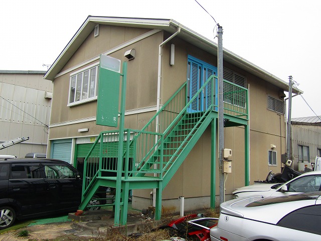 外壁 75㎡ 胴差 柱・オーバーハング シャッター 2階事務所引き違いドア 独立看板
