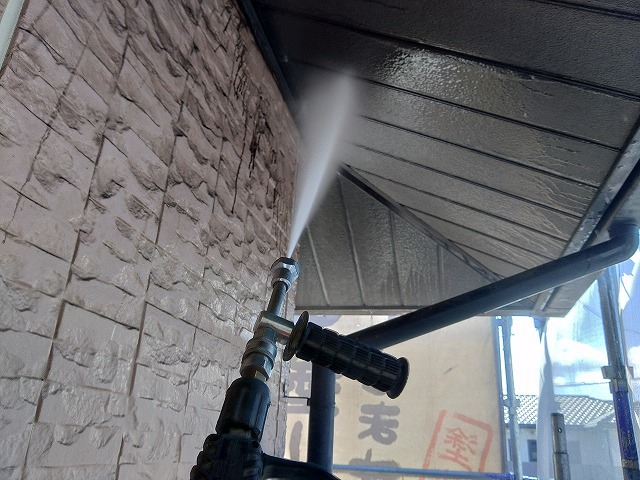 - 高圧洗浄機で洗浄をします。汚れやほこりを洗い流し、塗装がよく密着するようにします。
