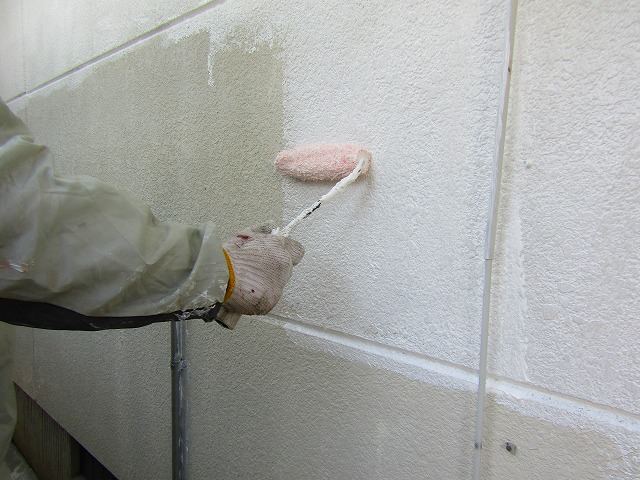 外壁はALCパネルで小さなひび割れが起きていました。微弾性の下塗り材サーフを使って割れにくくします。
