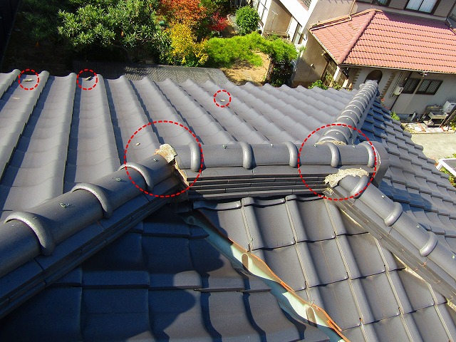 屋根は陶器瓦で塗装は必要ありませんが、棟部分にあるモルタルが劣化し剥がれ落ちていました。棟部分のモルタルは撤去し、新しく充填します。