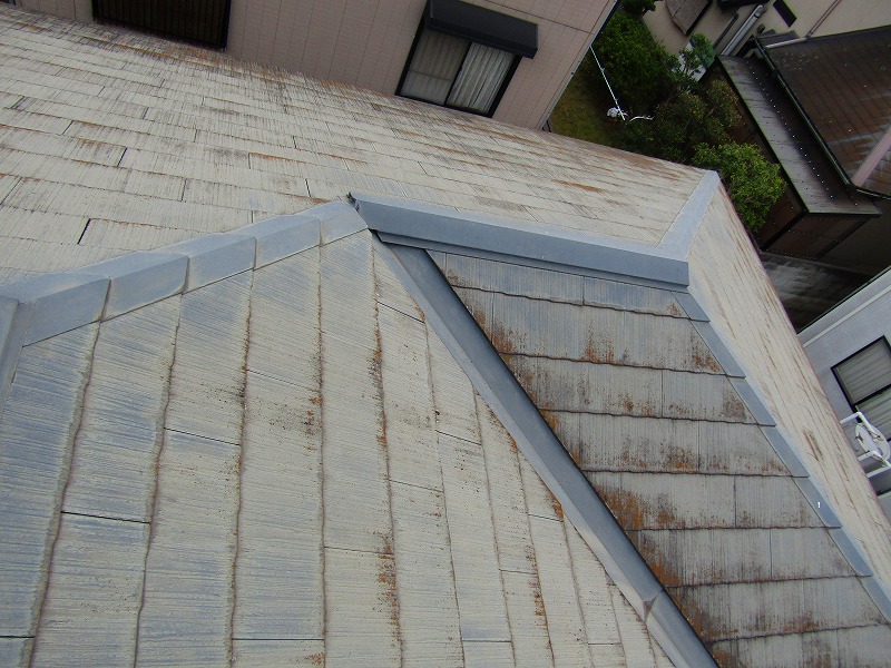 - 屋根も外壁も塗装が色褪せていました。防水性がなくなっているので塗装した基材を保護する必要があります。