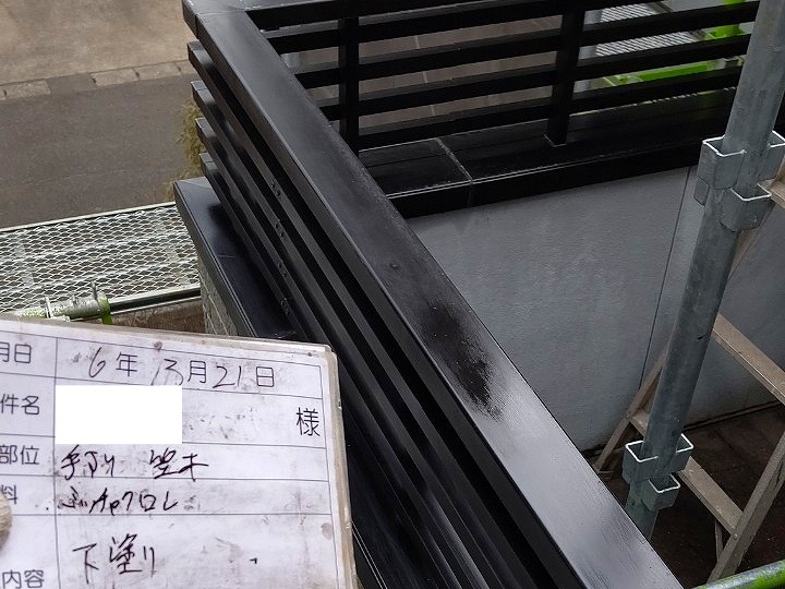 - バルコニー手摺はアルミなので、アルミ用の下塗り材を使って下塗りをします。