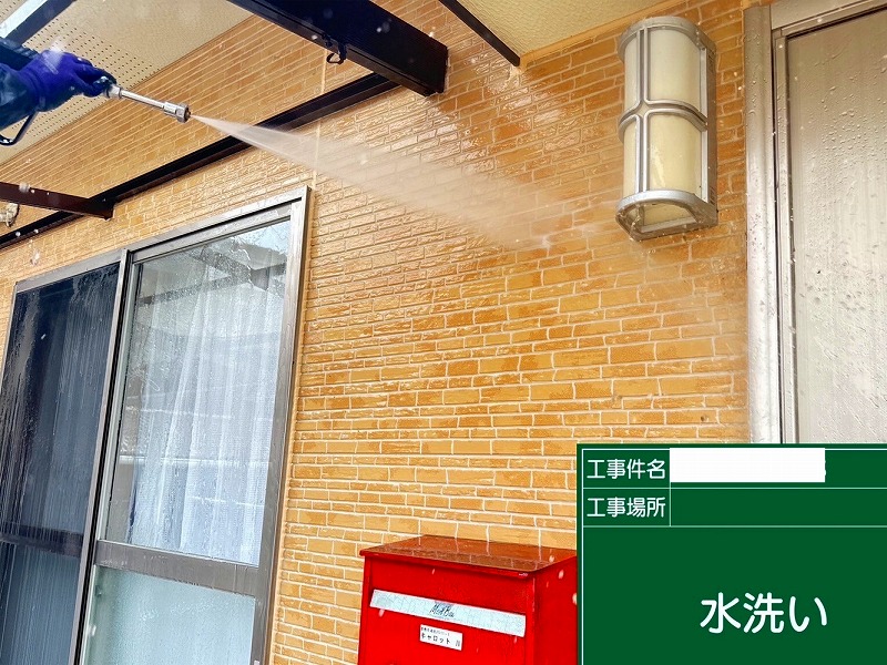 - 洗浄作業です。コーキングの撤去・打ち替え、下地処理をしてから高圧洗浄機を使って洗浄をします。