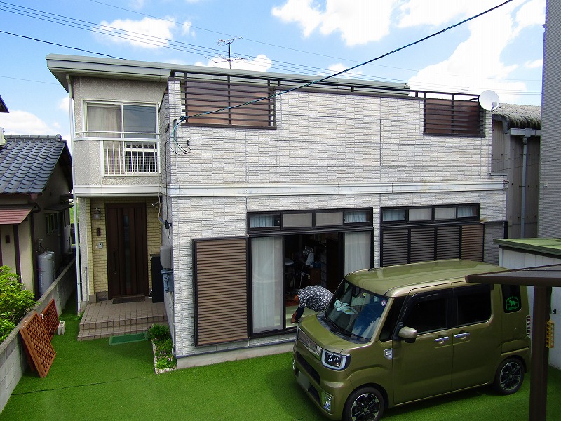 - 塗装前の全景です。過去に増築リフォームをされていました。増築部分のサイディングに割れが多くありました。