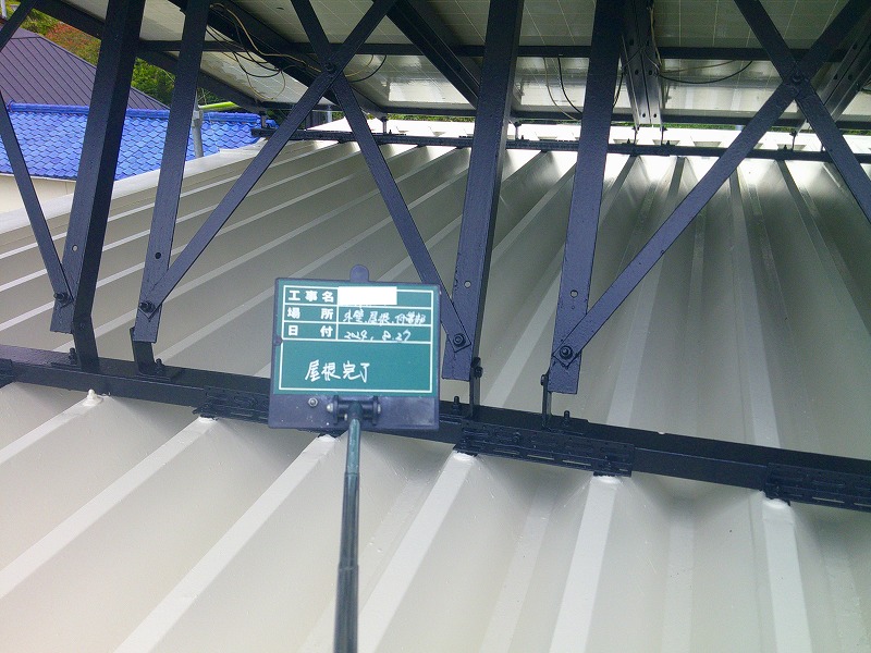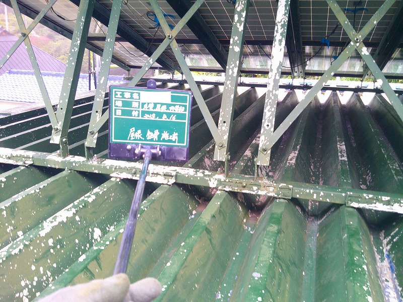 - 屋根は折半屋根で太陽光パネルが乗っていました。サビをしっかりケレンで除去し塗装します。
