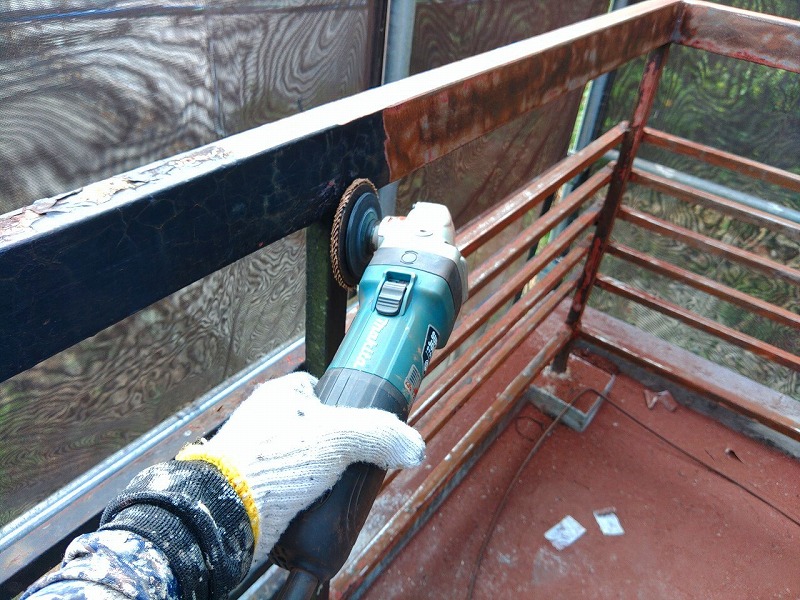 - 屋根がないバルコニーの手すりはサビが多く出ていました。サンダーケレンを使って除去しました。