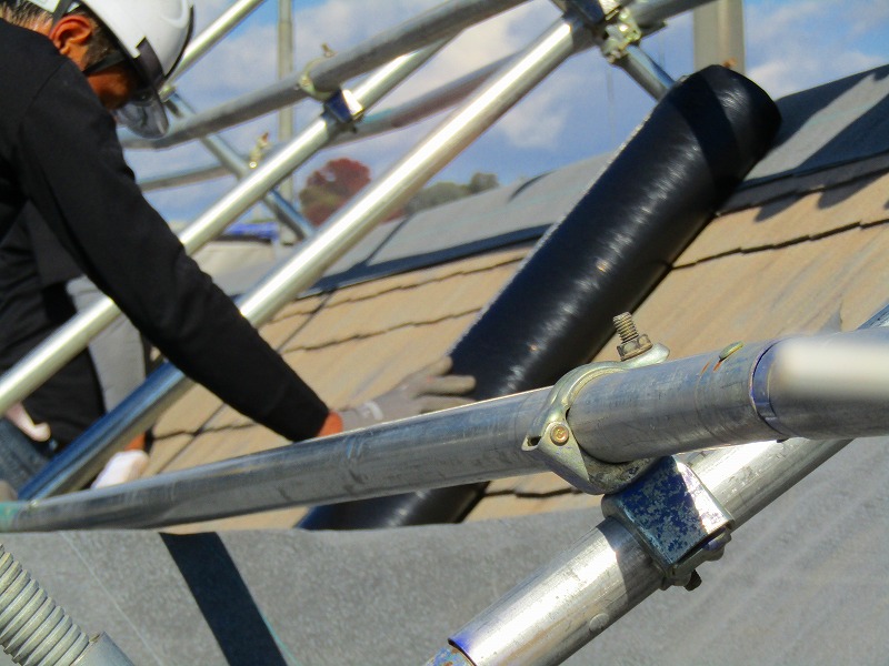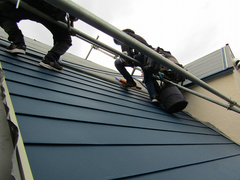 - カバー工法工事です。既存の屋根材の上にルーフィングを貼っていきます。