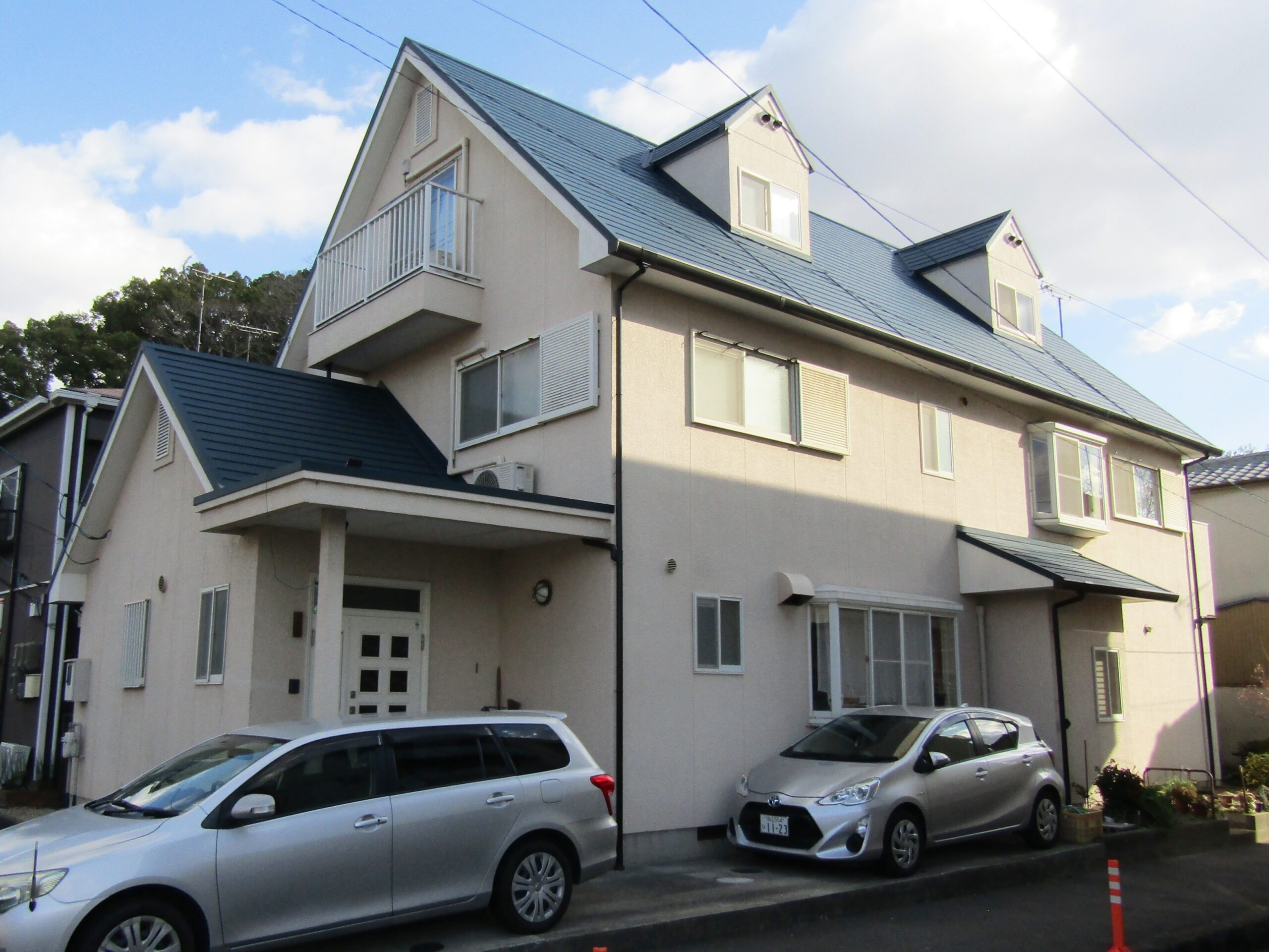 屋根は傷みが進行して塗装ではまた剥がれてしまうような状態でした。基材はそのままで工事ができるカバー工法をご提案しました。遮音性、断熱性が高くなり、撤去費用、処分費がかからないのでスレート屋根のメンテナンスにおすすめです。
