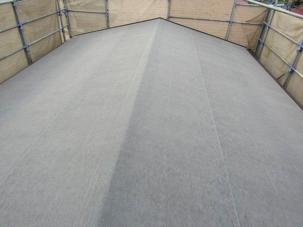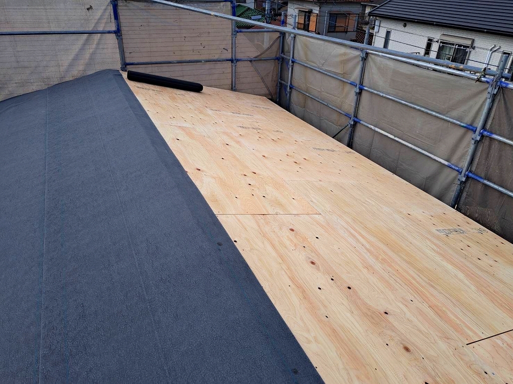 - 防水紙のルーフィングを敷きます。その上にガルバリウム鋼板の屋根材を設置していきます。