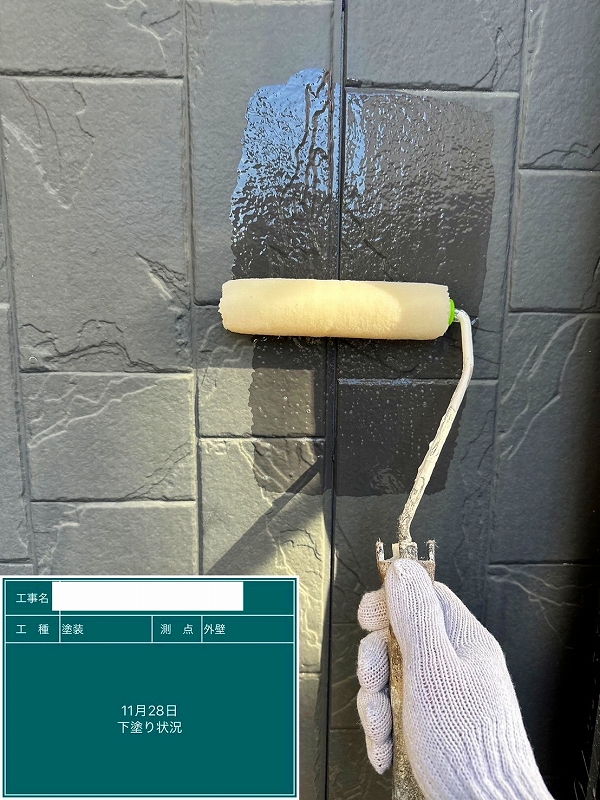 - 外壁の下塗りです。下塗りは下地と上塗り塗装を密着させる役割があります。