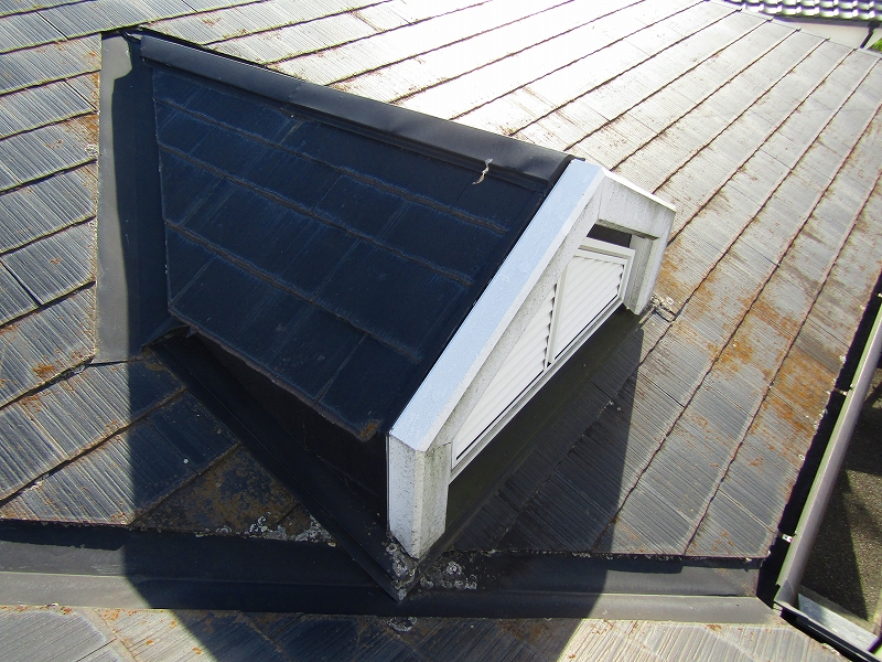 - 屋根はスレートで雨水が吸い込み苔や藻が生えていました。フッ素で塗装し苔が生えにくくします。