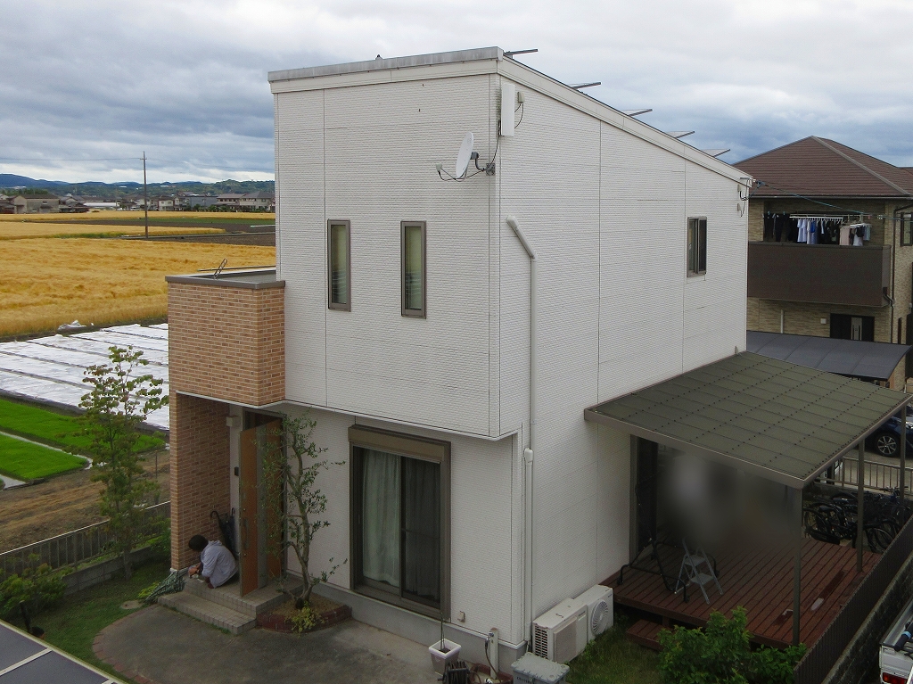 - 塗装前の全景です。白い外壁なので色褪せは分かりにくいですが、剥がれている箇所が多くありました。