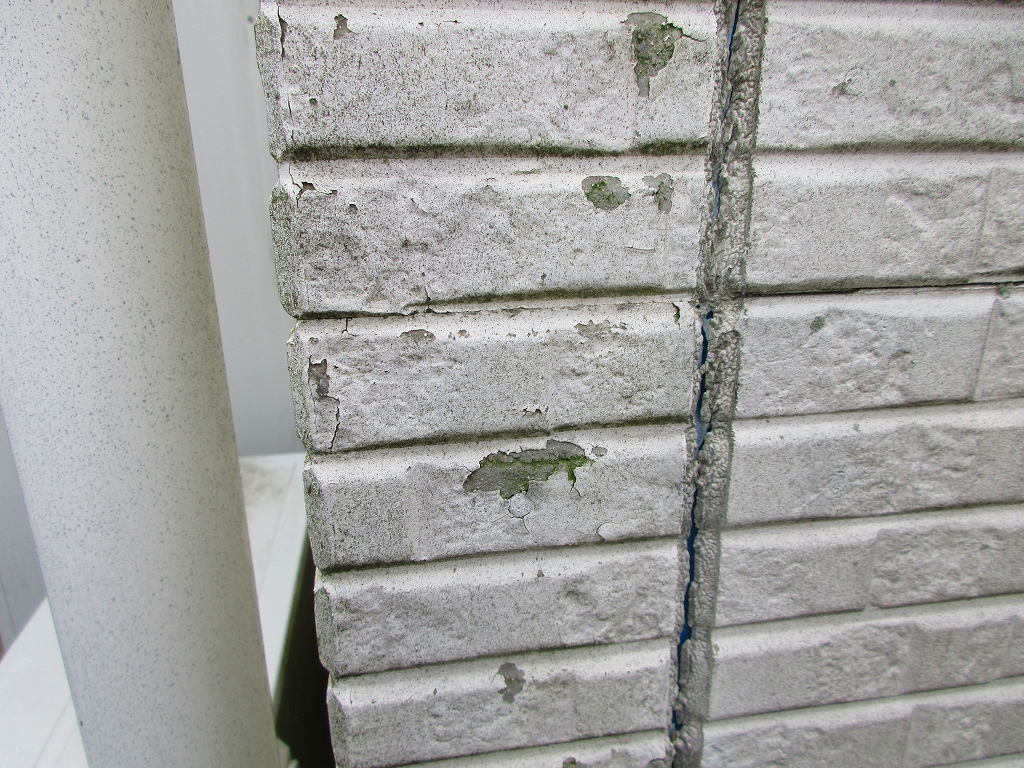 外壁は経年劣化により、防水性能が低下しています。外壁目地の割れから水分を吸ってサイディングが反り、爆裂箇所も多数見れました。メンテナンスの時期に来ています。