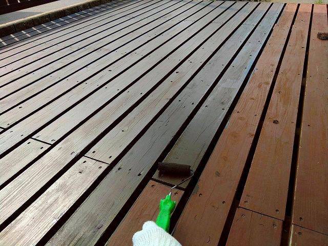 - ウッドデッキの塗装です。塗料は木専用のガードラックアクアを使用しました。