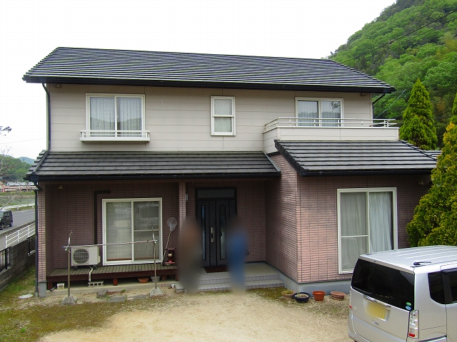 - 施工前の全景です。色褪せが目立ち、サイディングが割れたり剥がれを起こしている箇所もありました。