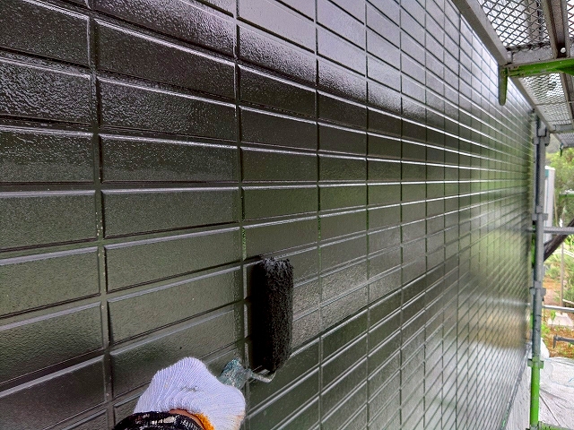 - 外壁の上塗りをしています。モスグリーンが美しいです。