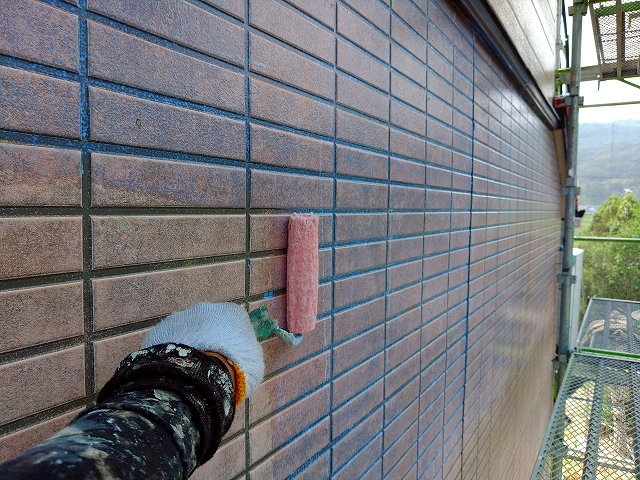 - 外壁の下塗りをしています。劣化が大きかったので、下塗り材はミラクシーラーエポを使用しました。