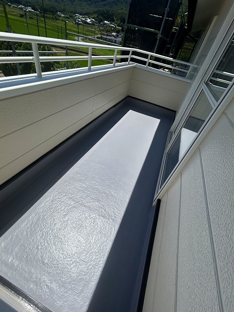 - 防水工事の完成です。防水層は割れると雨漏りし、基材を傷めてしまいます。定期的にメンテナンスをすると安心です。